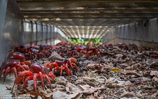 澳洲紅蟹大遷移:每年的10月底到1月初是澳大利亞圣誕島的雨季期間,就是紅蟹橫行圣誕島大遷徙的時間。澳洲紅蟹會離開叢林中的巢穴,遷徙到海邊進行交配和產卵。從巢穴到海岸,距離是不一樣的。最短的一個星期左右可以到達,最長的需要20天左右。
