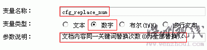 在后臺(tái)系統(tǒng)設(shè)置中 添加新變量 變量名為 cfg_replace_num 并且設(shè)置成你所希望的數(shù)字型數(shù)量。cfg_replace_num的解釋為:文檔內(nèi)容同一關(guān)鍵詞替換次數(shù)(0為全部替換):