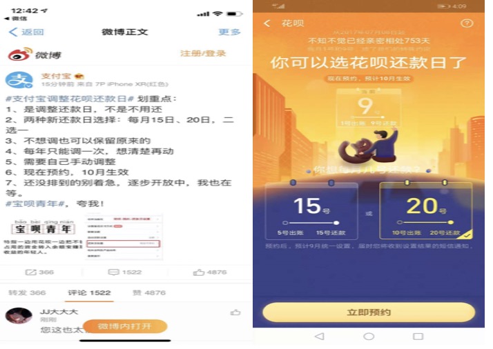 此次支付寶花唄還款日調整的原因之一是用戶的意見反饋。由于不少單位發(fā)工資的時間在每月的15日左右,而原來的還款日恰好在此之前,許多用戶在還款時往往會遇到手頭緊張的情況,而還款日的調整在很大程度上減輕用戶還款壓力了、降低逾期還款風險。