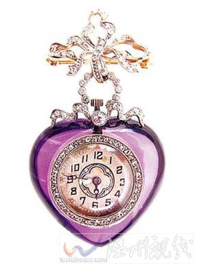 使用紫水晶、黃金和鉆石的吊墜,制作于1910年,精密機械業的高度發展讓它在方寸間飾以完整的鐘表。