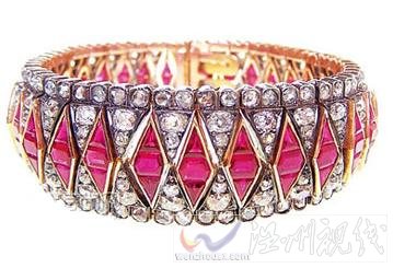 藝術風格手鐲,制作于1880年,菱形切工紅寶石和鉆石組合出類似裝飾主義和維多利亞風格混合的美感,在它的時代,它無疑是超前的。